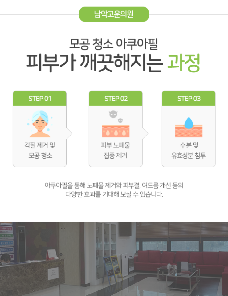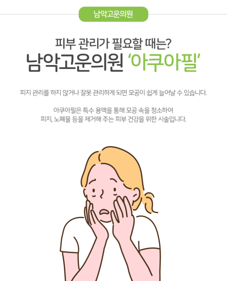 그렇기에 방치하고 상태를 돌보지 않을수록 문제 상황이 돋보이는 일이 벌어지게 되는 것이라고 생각하시면 되겠습니다. 무엇보다도 모공 관련 문제는 초기에 대응하지 않으면 점점 모공이 늘어지며 피부결이 거칠어 보이는 등의 피해를 주고는 합니다. 이 때문에 모공과 관련한 고민을 지니고 있을 때에는 남악 아쿠아필과 같은 시술을 통해 피부 상태가 정상적인 수준을 유지할 수 있게 노력해 주실 것을 권유드리고는 합니다.