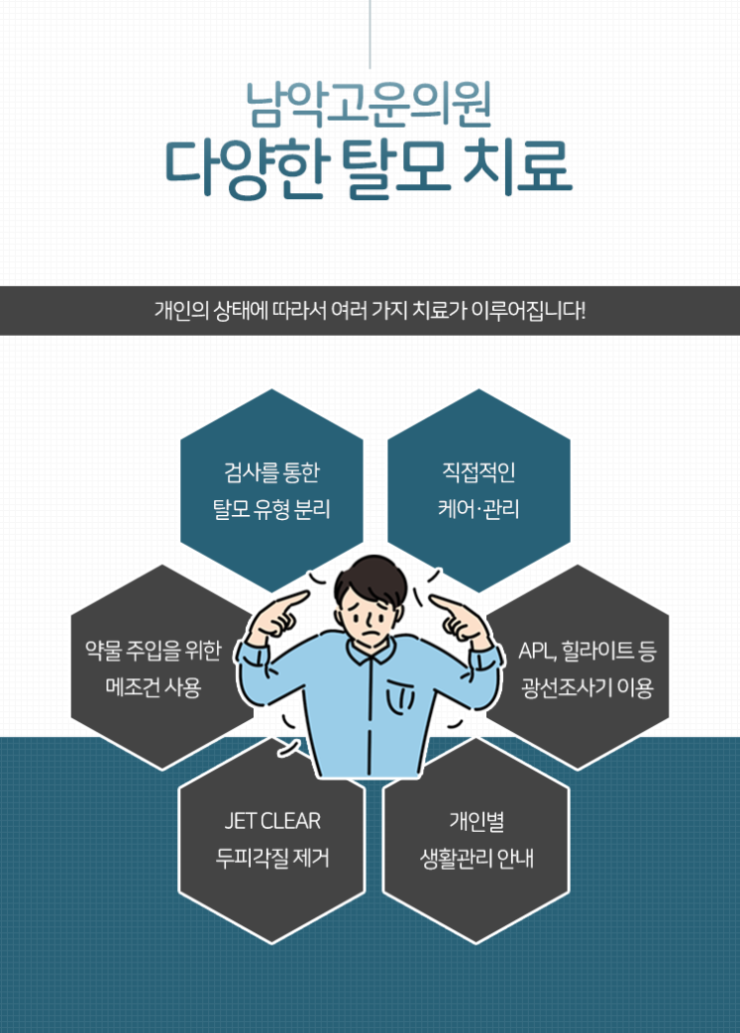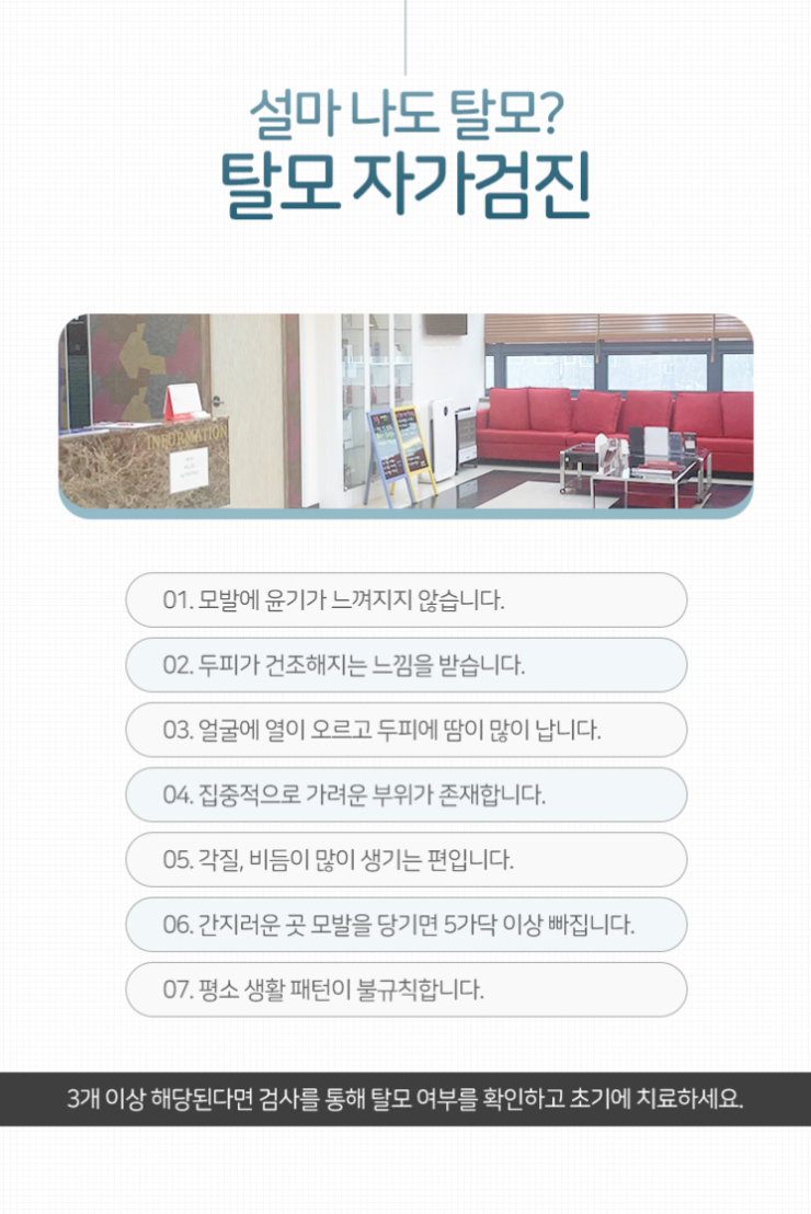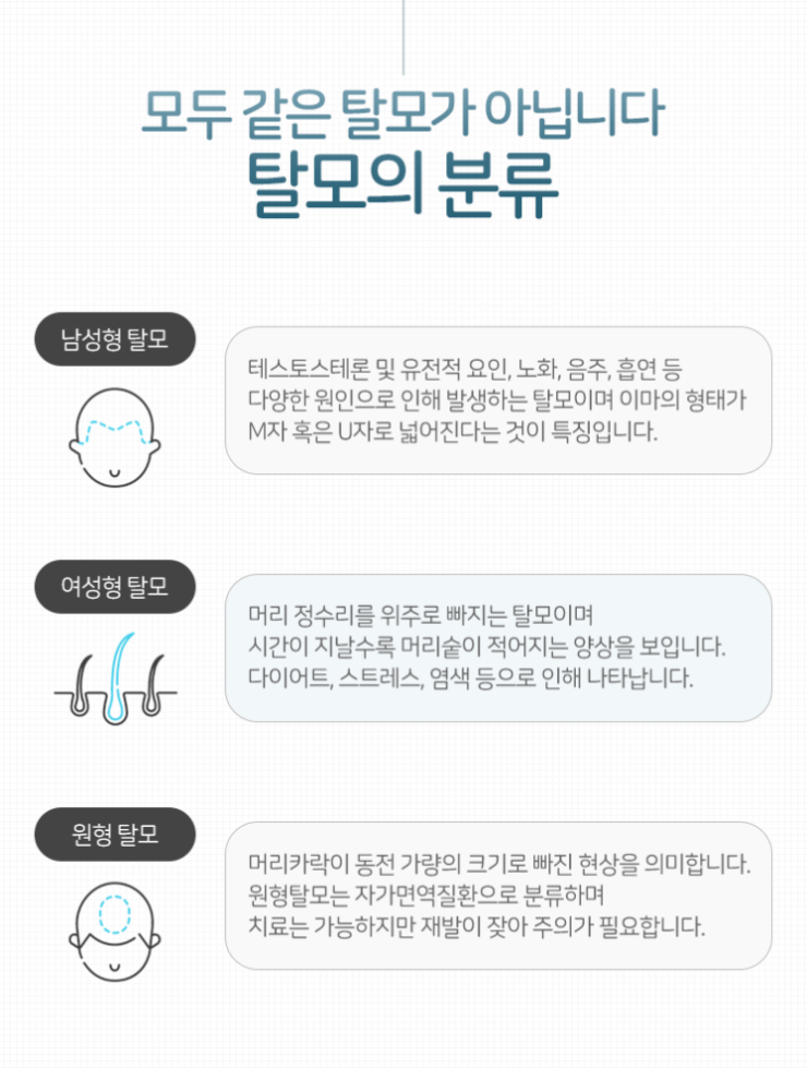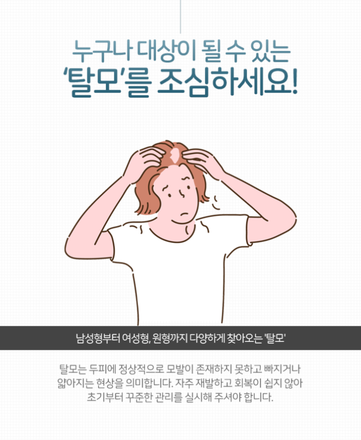 탈모는 머리카락이 빠지는 증상 외에도 다양한 문제의 원인이 됩니다. 두피가 건조해지고 이로 인해 가려움이 느껴지는 등의 문제가 동반될 수 있다는 의미입니다. 이것은 삶의 질을 떨어트릴 뿐만 아니라 탈모를 더욱 악화시키는 원인으로까지 작용하게 됩니다. 따라서 이런 증상이 있을 때부터 미리미리 내원을 하셔서 상태가 얼마나 악화되어 있는지 살필 수 있도록 노력해 주시기를 바랍니다.