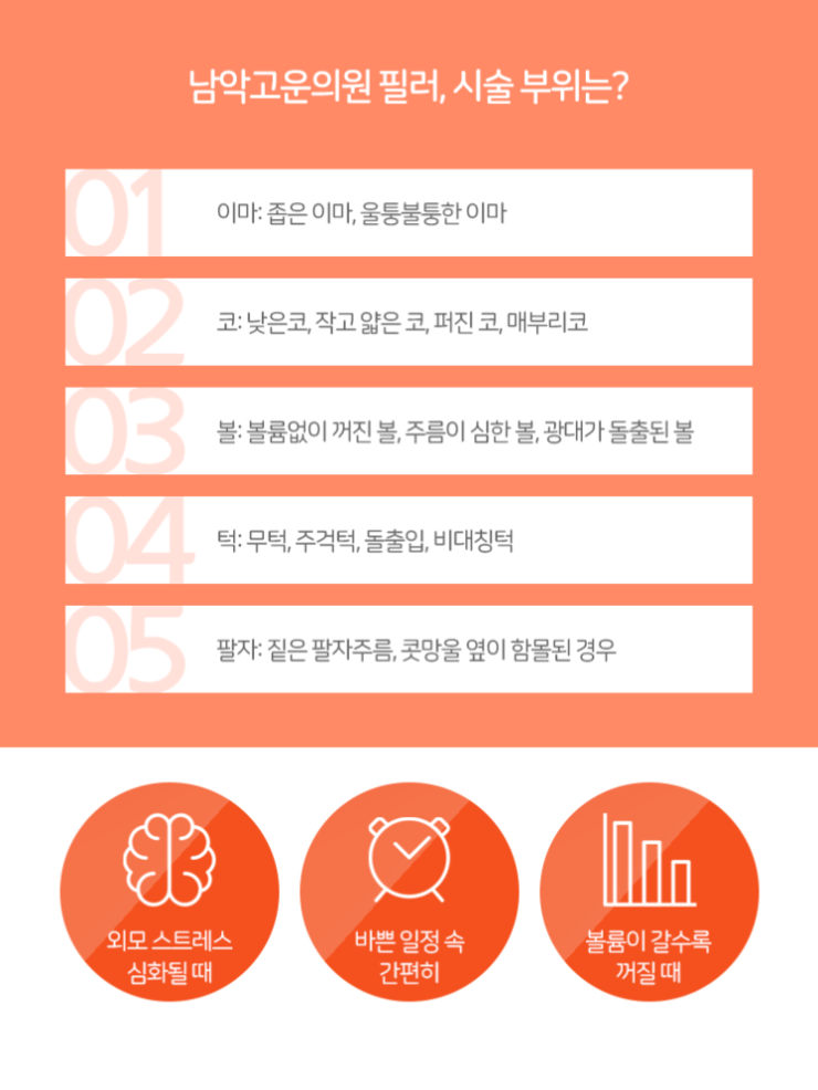 필러 시술은 코, 이마, 턱, 입술, 애교살 등 얼굴의 다양한 부위에 적용이 된다는 것이 특징이라고 생각해 주시면 되겠습니다. 이 시술을 통하여 볼륨감이 부족했던 곳을 더 입체적으로 가꿔 나갈 수 있을 것이라고 말씀을 드립니다. 해당 시술은 주로 히알루론산 성분을 이용한다는 것이 특징인데 이것을 통해 볼륨감을 더해 주게 된다면 안면부의 특성을 고려한 변화를 자연스럽게 이끌어낼 수 있을 것이라는 말씀을 전해드릴 수 있겠습니다.