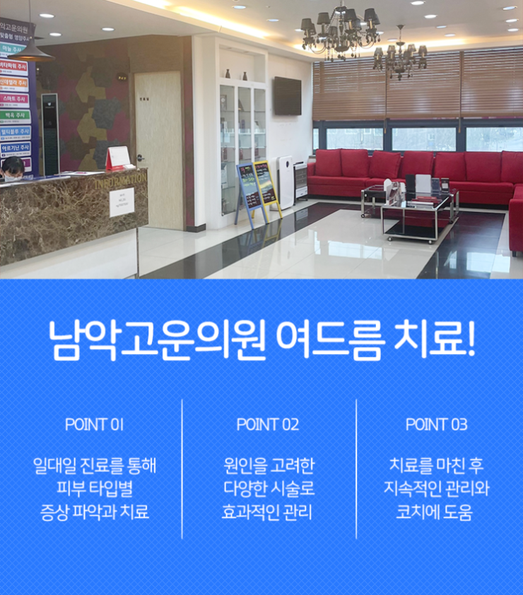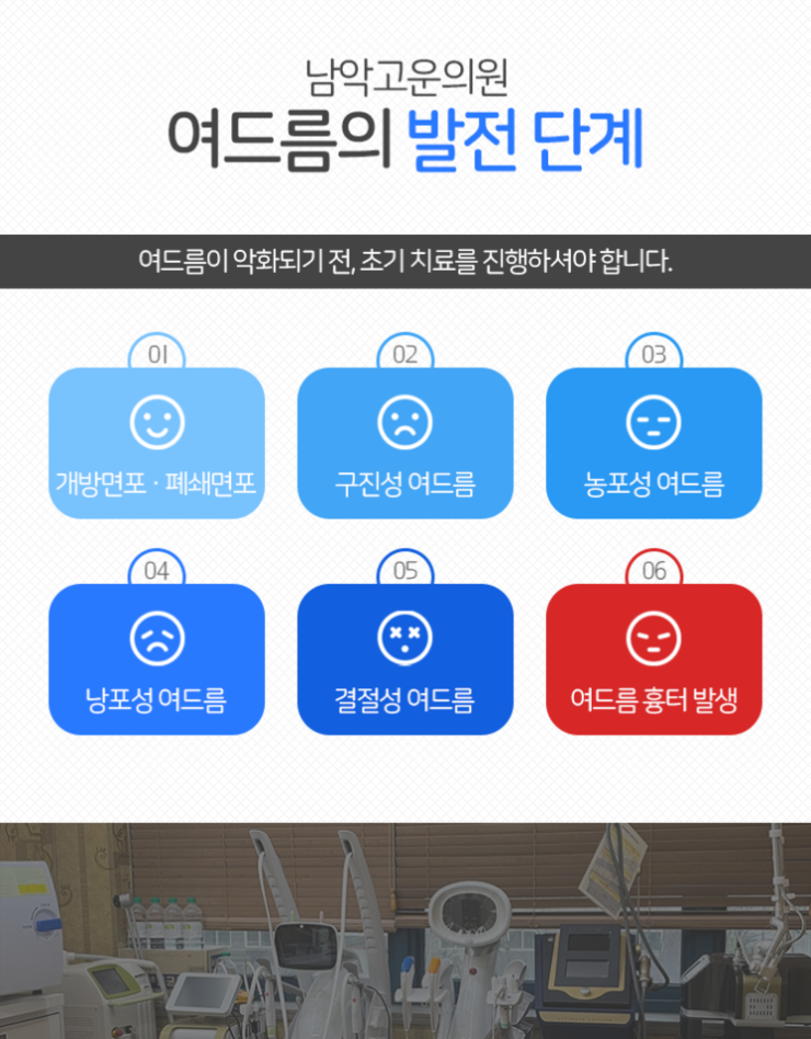 안녕하세요. 남악고운의원이 인사를 전해드립니다. 날이 부쩍 무더워짐에 따라서 고민하게 되는 곳은 단연 피부일 것이라는 생각이 듭니다. 무더운 날씨 탓에 자연스럽게 피지의 분비량이 늘어나는 경우가 많고, 이것은 그대로 모공을 막는 원인이 되면서 종국에는 울긋불긋한 여드름이 피부 곳곳을 차지하게끔 만드는 원인으로 작용하게 됩니다. 여드름이 한두 개 모습을 드러냈다가도 금방 진정이 된다면 개의치 않아도 되겠지만, 반대로 여드름이 계속 자리를 하고 있는 경우가 있습니다. 이런 때에는 따로 목포 여드름 치료를 위해 노력하실 것을 권유드리고 싶은데요. 초기에 관리하지 않는다면 훗날 자국이나 흉터를 남기기도 하고 계속된 재발로 인한 고민을 떠안게 될 수도 있다는 말씀을 전해드립니다.