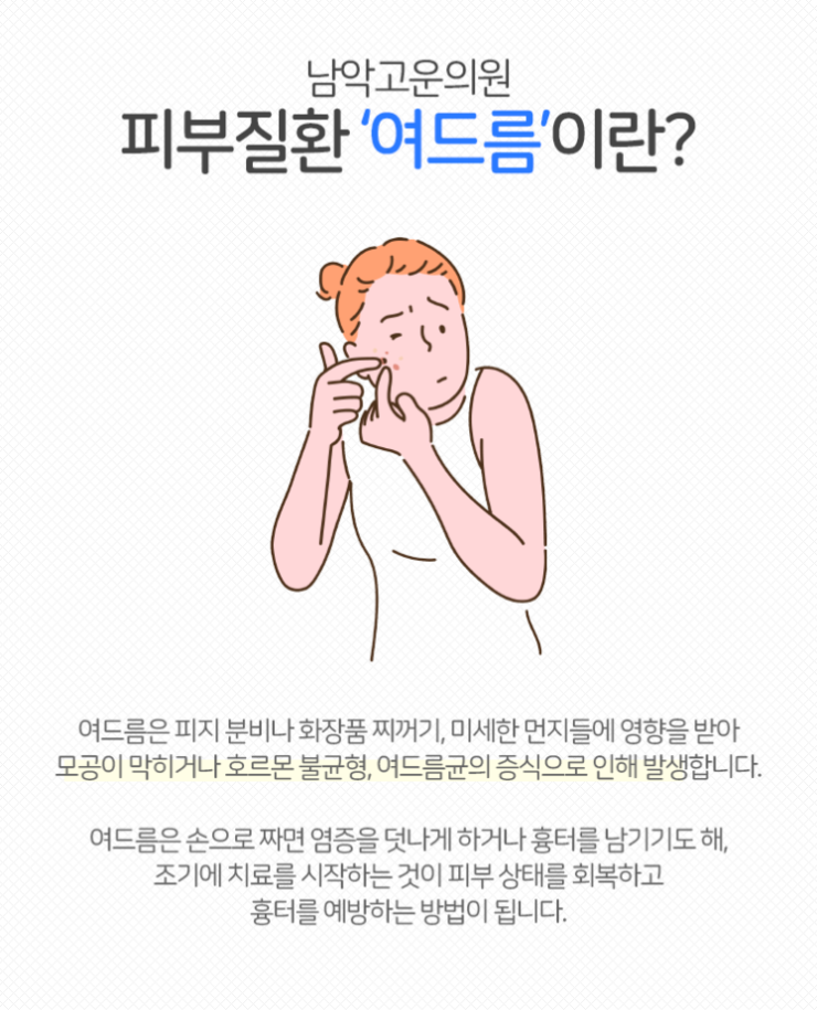 피부에는 여드름 이외에도 다양한 고민거리가 발생하기 마련입니다. 여러 질환은 물론이거니와 탄력 저하, 주름 등 나이가 들면서 어쩔 수 없이 맞닥뜨려야 하는 문제들이 찾아오게 되기도 합니다. 그렇다보니 피부에 대한 고민은 어릴 적부터 성인이 된 이후까지 끊이지 않고 계속 이어질 것이라는 생각이 드는데요. 이런 고민거리가 존재하고 있을 때에는 혼자 끙끙 앓기보다는 어떻게 개선을 할 수 있을지 생각해 보고, 상태에 따른 시술까지 진행해 보실 것을 권유드립니다. 본원에서는 프락셀, 슈링크, 필러, 보톡스 등 다양한 시술을 도와드리고 있으며 피부로 찾아온 복합적인 고민을 회복하는 데에 보탬이 되어 드립니다. 감사합니다.