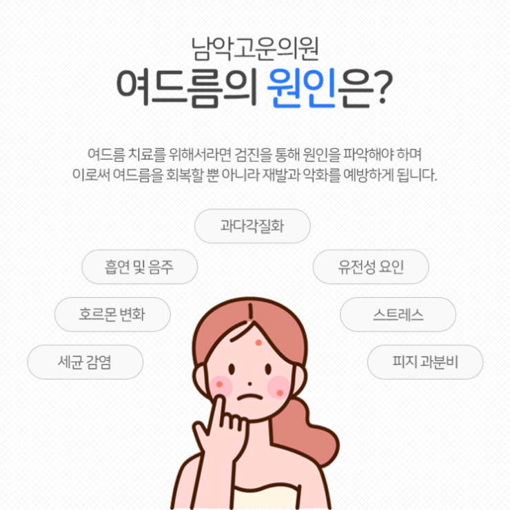 여드름이 찾아오는 데에는 다양한 요인들이 개입을 하고 있다고 설명드립니다. 단순히 날이 더워서만 피지선이 자극을 받게 되는 것이 아니기 때문입니다. 그외에도 식습관이나 스트레스, 화장품 사용 등이 영향을 미치게 될 수 있으며, 스트레스도 문제를 일으키는 원인이 됩니다. 또한 개인이 관리하기 어려운 호르몬 문제가 여드름을 유발하기도 합니다. 사춘기 무렵에 여드름이 올라오는 것도, 여성분들이 월경 시기에 여드름으로 고민하게 되는 것도 호르몬의 영향을 받기 때문이라고 설명드릴 수가 있겠습니다.