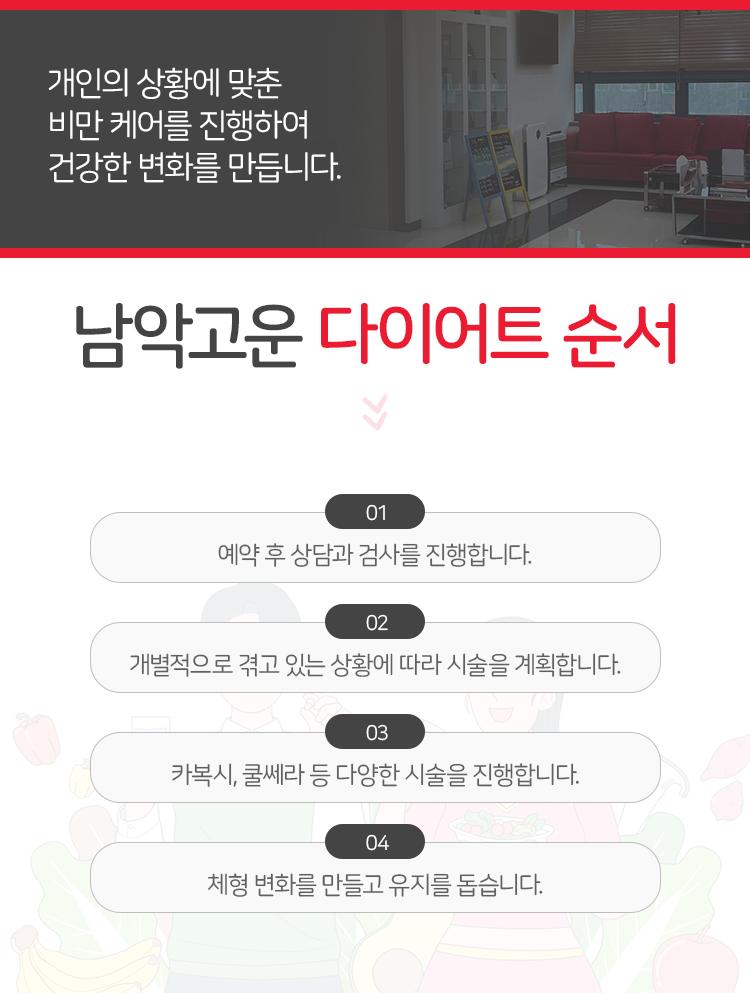 건강이나 외관상 이유 등으로 다이어트를 생각하고 계실 텐데요. 그리고 어떤 분들께서는 중요한 일정을 코앞에 두고 변화를 만들어야 한다고 생각한 적도 있을 것이라는 생각이 듭니다. 시술을 진행해 보신다면 짧은 시간 내에 변화를 만들어 나가실 수 있을 거라고 말씀을 드리오니 참고해 주시길 바라겠습니다.