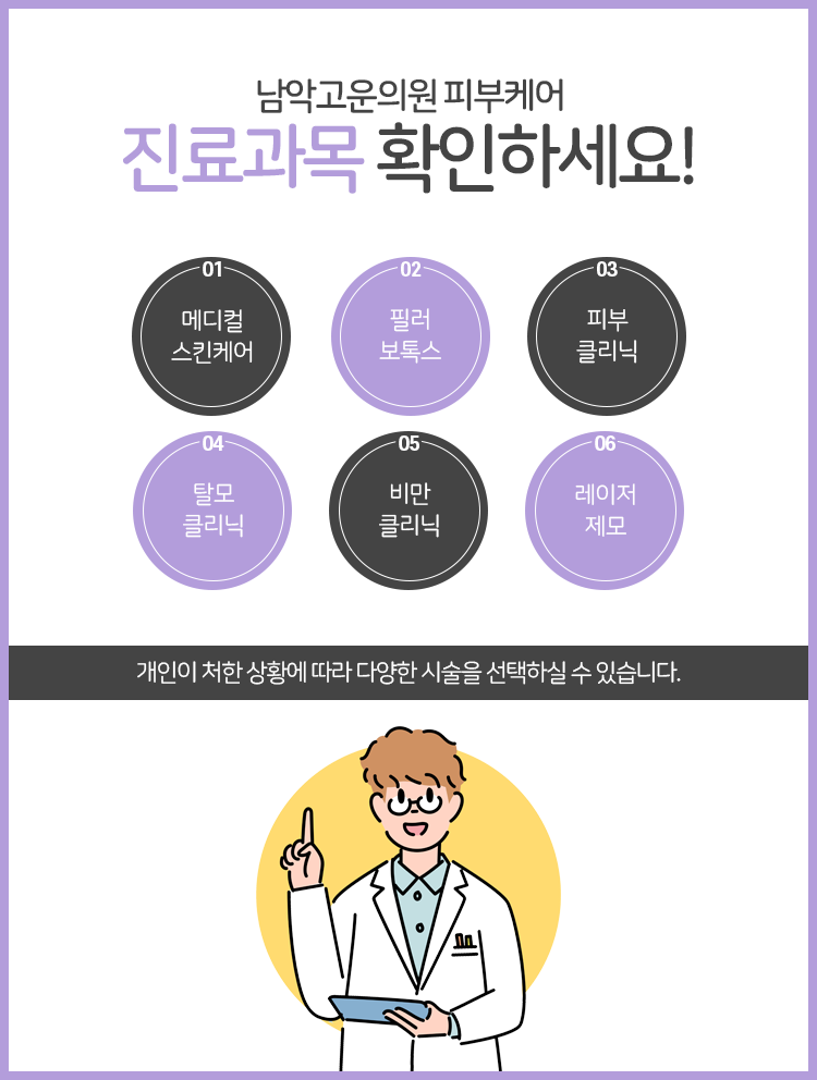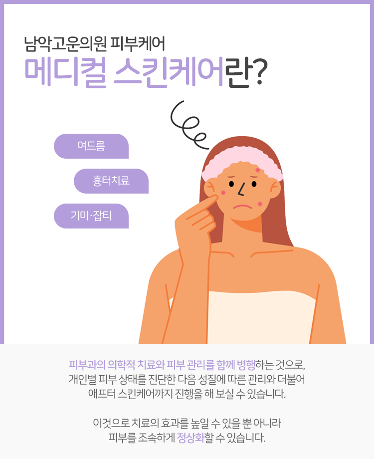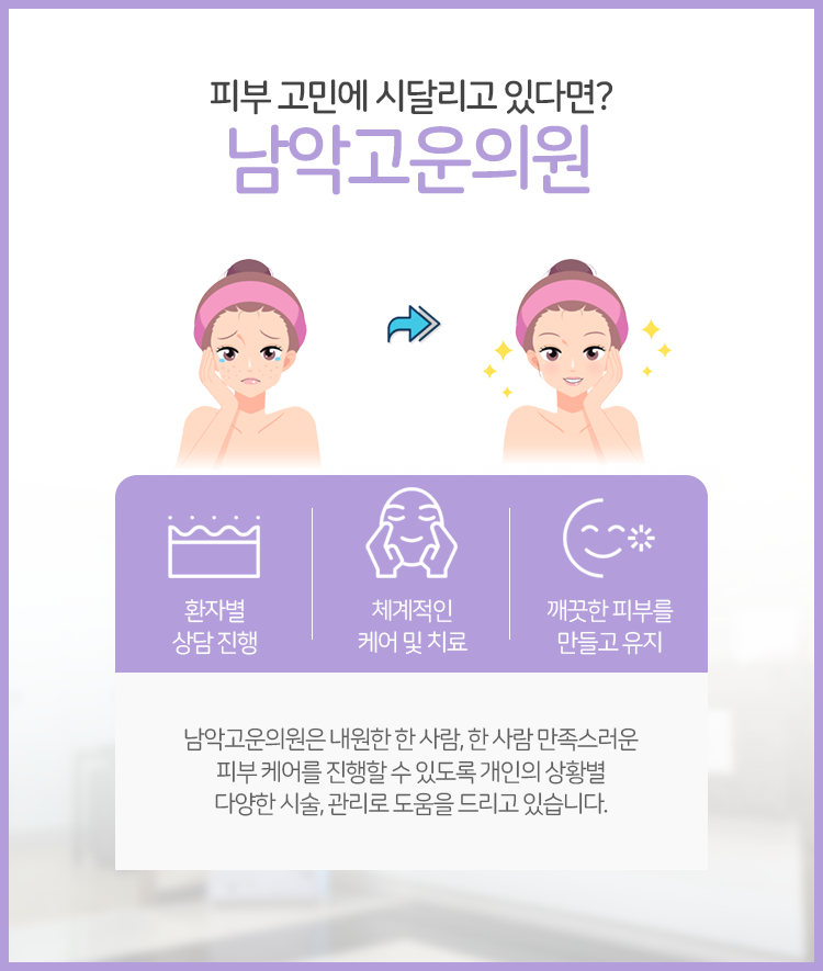 맑고 건강한 피부를 원하는 마음은 결코 과도한 욕심이라 할 수 없습니다. 사람의 외모와 전체적인 분위기를 결정하는 데 피부가 차지하는 비중은 상당히 크기 때문입니다. 그런 만큼 피부와 관련된 고민이 있으시다면 적극적인 관리에 나서시길 권유드리고 싶습니다. 다만 이때의 관리는 개인적인 차원에서 그치는 게 오히려 아쉬움을 자아낼 수 있습니다.