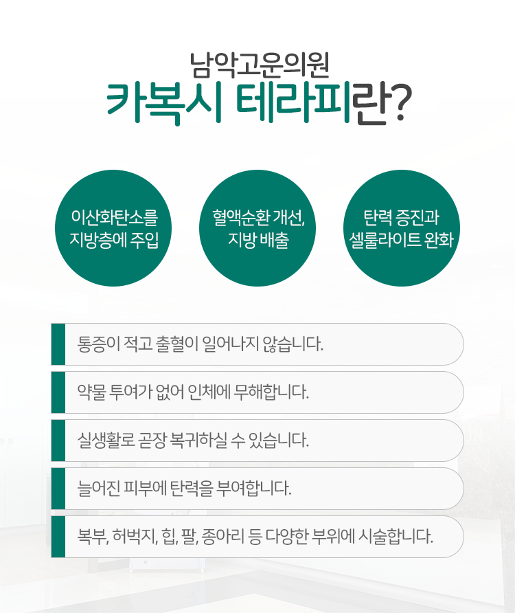 그 가운데에서도 주로 말씀드리고 있는 것은 이산화탄소를 활용하는 방식의 카복시테라피입니다. 이것을 피부, 피하조직 쪽으로 주입하면 일시적으로 산소량이 부족한 상태가 되는데요. 때문에 사람의 몸은 산소를 공급하기 위해 혈관을 확장시키고 혈류량은 자연히 증가하게 됩니다. 이런 과정을 통하여 신진대사를 활발하게 해 줄 수 있는 것입니다.