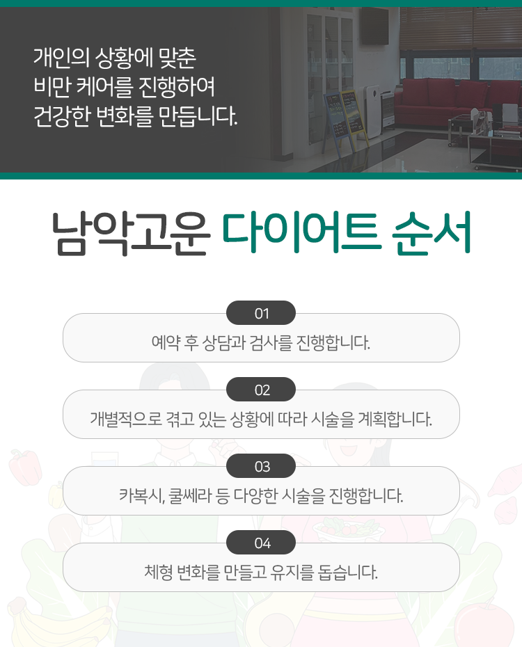 군살을 빼기 위해 운동을 시도해 보기도 하며 개인적인 노력을 기울이셨을 것입니다. 그러나 노력이 무색하게도 상태는 여전히 제자리를 걷고 있어 고민을 하고 계실 수 있는데요. 이런 상황 속에서 남악 비만클리닉은 다양한 시술로 접근을 하고 있습니다. 무엇보다도 살을 빼야만 하는 이유가 있는 분들께 시술이 도움이 되어 줄 수 있습니다. 곧 떠나야 하는 여행이라거나 결혼 등을 앞두고 있어 짧은 시일 내에 변화를 만들어야 한다면 시술이 이를 도울 수 있다고 생각해 주시면 되겠습니다.