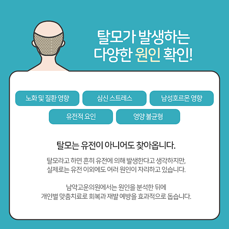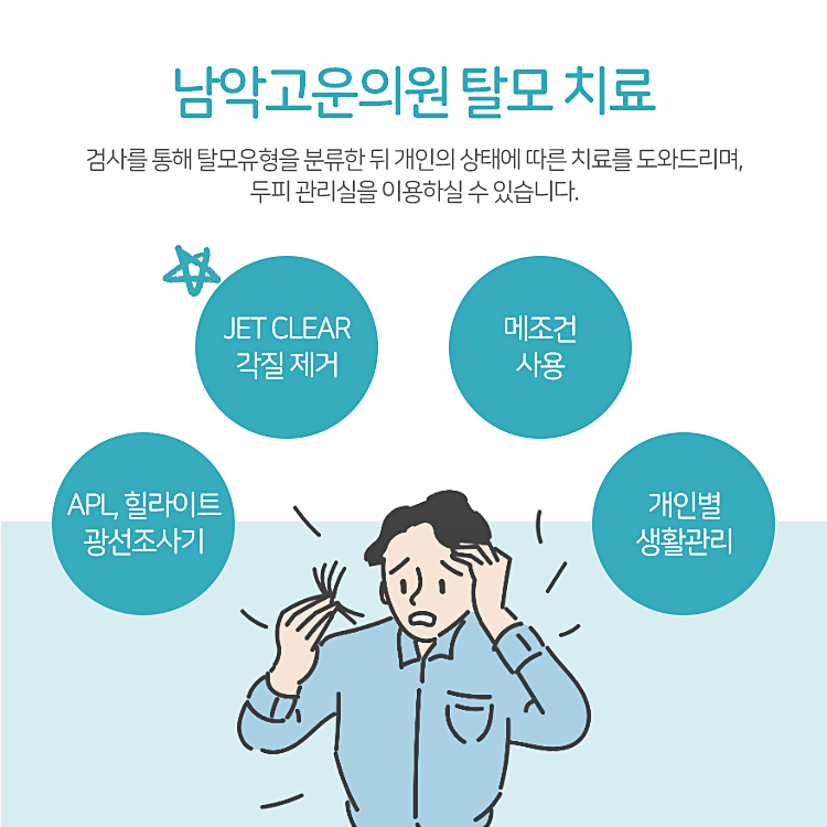 그렇다고 해서 자신의 두피를 그대로 공개하고 다니기에는 사람들의 시선을 의식하게 되기도 하고 그만큼 걱정도 많이 드셨을 텐데요. 탈모는 일반적으로 시간이 흐를수록 상태가 심화되는 경향을 보이는 존재이기 때문에 거슬린다는 생각을 가지고 있다면 늦지 않게 목포 탈모치료를 진행하는 것이 중요하다고 남악고운의원에서는 설명을 전해드리고 있습니다.