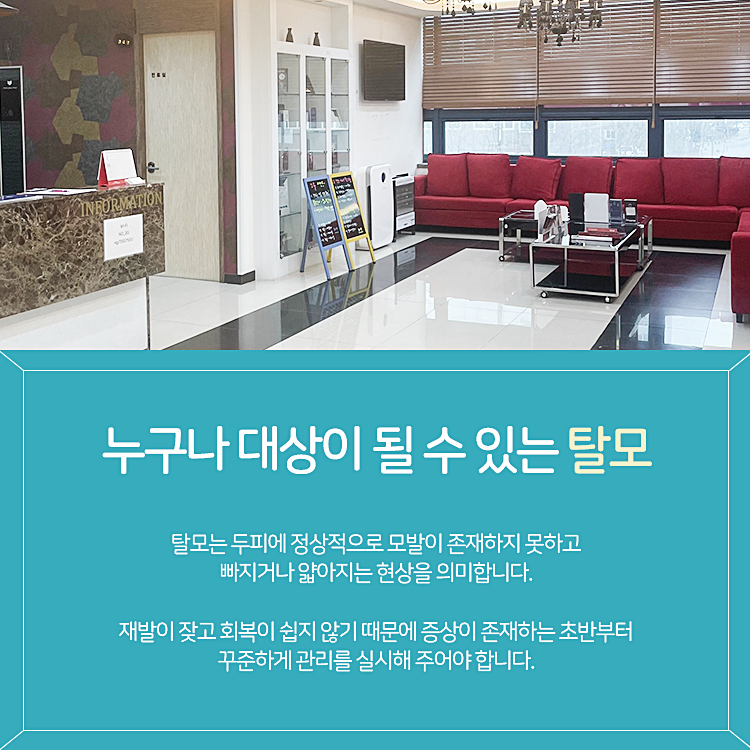 머리카락의 경우에는 대부분이 가지고 있다 보니 기본적인 것이라는 생각에 당연하다고만 느끼기 마련인데요. 이 때문에 머리카락이 없고 비어 보일 때의 고통과 괴로움이 더 크게 와닿을 것이라는 생각이 듭니다. 서둘러 초기에 치료하지 않는다면 시간이 흐를수록 문제 상태가 심화되어 나타나는 일도 비일비재한 만큼, 이상이 더 커지기 전에 초기 관리를 위한 노력부터 기울이시길 바랍니다.