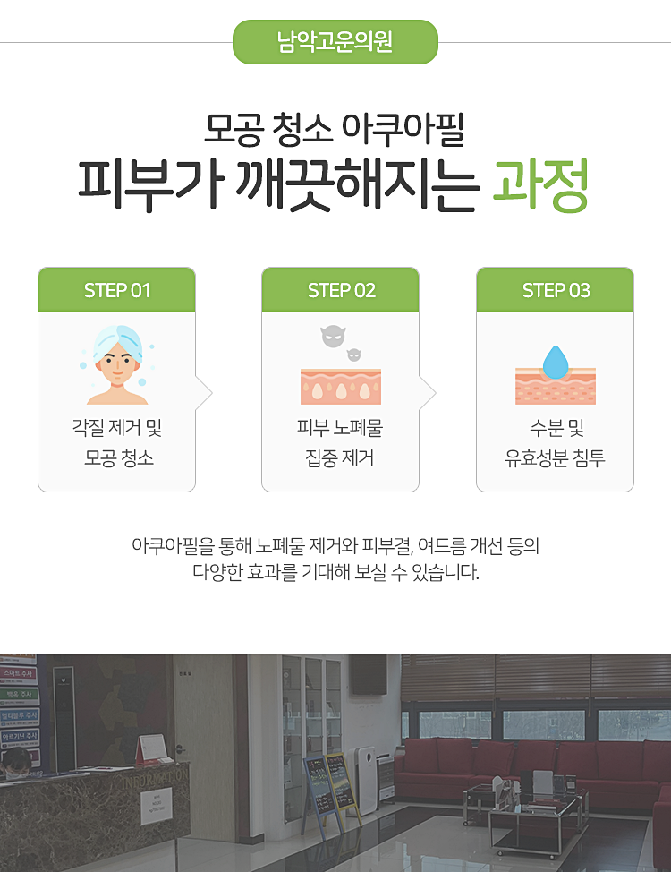 피부를 관리할 수 있는 방법은 한두 가지가 아니고, 그렇기에 더욱 어떻게 관리하는 것이 현명한 방안으로 작용하고 있는지 고민하게 되셨을 것입니다. 이런 때 선택해 보실 수 있는 시술 중 하나가 남악고운의원에서도 진행하고 있는 목포 아쿠아필이라고 생각해 주시면 되겠는데요. 아쿠아필은 총 세 가지 단계를 거쳐 피부의 상태를 안정화하고 모공 안쪽을 깨끗하게 비워 주는 과정부터 수분 및 영양의 공급까지 전달해 준다는 것이 특징이라고 생각하시면 되겠습니다.