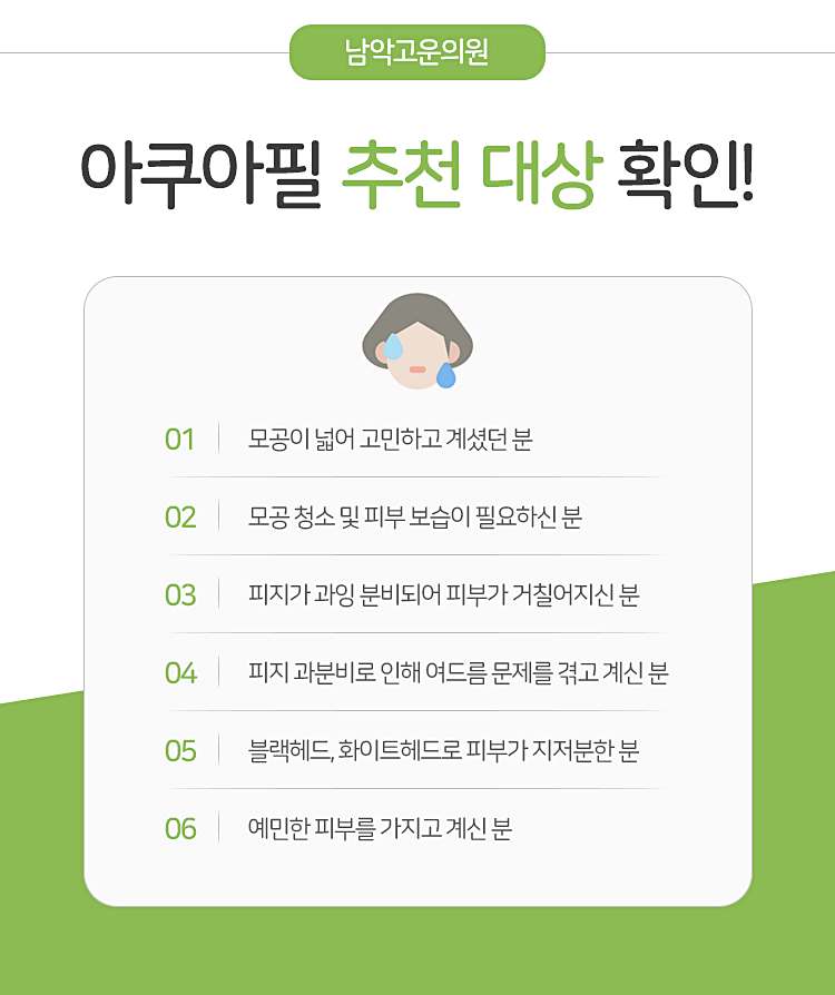 그런 데다가 면포들은 추후 염증성 여드름으로 발전을 하며 문제를 키우기도 합니다. 뿐만 아니라 각질이 계속 뜨게 되면서 화장이 쉽게 들뜨고 피부 건조함이 눈에 띄는 등의 세세한 고민을 떠안길 때도 있습니다. 이런 상황들이 겹쳐지게 되면서 피부에 대한 고민 역시도 같이 커져가셨을 텐데요. 목포 아쿠아필 시술을 통해 전반적인 부분을 관리받아 보시기를 바라도록 하겠습니다. 개인의 피부 상태가 차이를 보이는 것은 당연한 일이라고 할 수 있겠습니다. 그렇기에 한 사람, 한 사람의 상태를 먼저 고려한 관리를 진행하면서 변화를 찾으실 수 있도록 도움을 전해드리겠습니다.