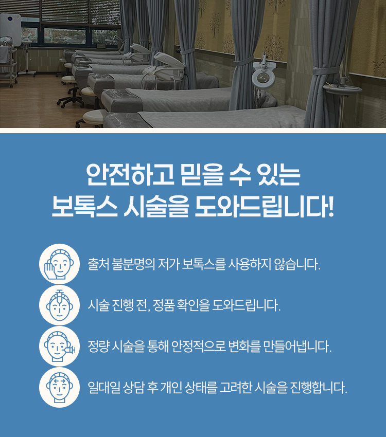 보톡스 시술은 비교적 간단한 과정으로 진행된다고 하지만 그럼에도 불구하고 관련 내용을 잘 알아본 뒤에 선택을 해서 내원과 시술까지 도움받아 보시길 바라도록 하겠습니다. 시술 후에는 시술 부위를 만지거나 자극하지 않도록 해 주시고 한동안 과격한 운동, 사우나, 음주, 흡연 등은 멀리하는 것이 도움이 됩니다. 또한 시술 후 4시간 정도는 누워 있지 않도록 해 달라는 점에 대해서도 같이 이야기드립니다. 이런 주의사항까지 같이 확인을 해 보시면서 서서히 변화를 찾아나가 보시길 바라겠습니다. 감사합니다.