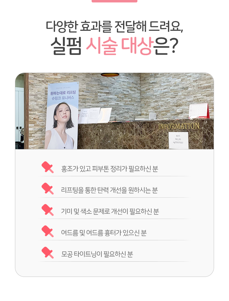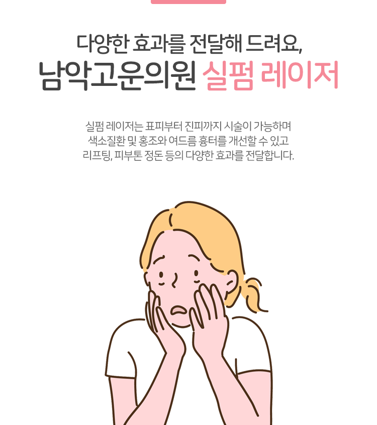색소질환을 치료하는 데에도 활용되고 있습니다. 전반적으로 피부의 톤을 엉망으로 망칠 수 있는 문제 상황들을 같이 개선하실 수 있기 때문에 도움받아 보시기를 바랍니다. 또한 남악 실펌의 경우에는 여드름이 올라오고 났던 자리에 패임 자국이 있을 때, 흉터 치료를 위해서도 활용하실 수 있습니다.