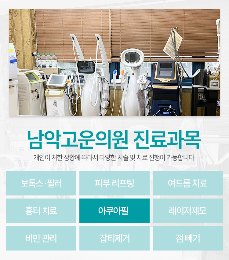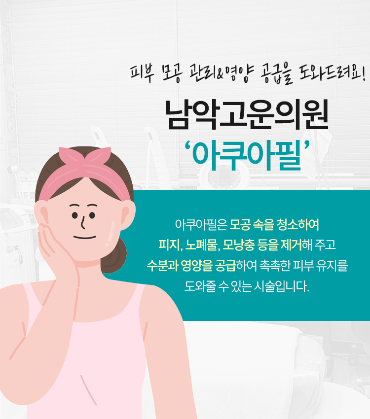 아쿠아필 시술은 쉽게 생각하면 모공을 청소하는 것과 영양을 공급하는 것, 두 가지에 중점을 둔 시술이라고 생각해 주시면 되겠는데요. 여드름이 이미 있는 분들께도 도움이 되어 줄 수 있고, 피지나 각질 문제가 존재하고 있다거나 수분감이 부족하신 분, 모낭충에 시달리는 분 등 전반적으로 부족한 피부의 상태를 긍정적인 쪽으로 변모시키는 데에 도움이 되어 줄 수 있다는 것이 특징이라고 보시면 되겠습니다. 피부의 상태가 어떤지 파악해 나가면서 간격을 둔 채 꾸준하게 목포 아쿠아필 시술을 받아 보실 것을 권유드리는데, 피부의 상태를 한결같이 유지하기 위해서라 생각해 주시면 됩니다.