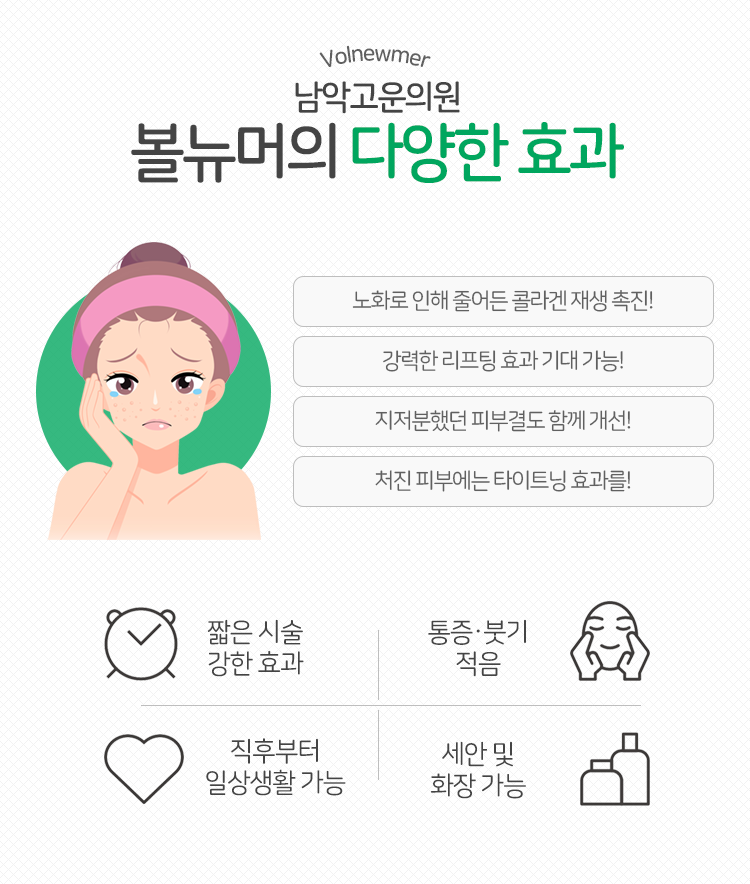 그런 만큼 다양한 피부 고민에 노출되어 있는 분들께 도움이 되어 줄 수 있는 시술이라고도 이야기함이 가능하겠습니다. 무엇보다 얼굴 잔주름, 탄력 저하가 고민되셨던 분들이라면 도움을 받아 보심이 가능하겠습니다. 눈가, 입가, 미세하게나마 팔자주름 등이 점점 눈에 띄게 늘어나고 있는 상황이라면 볼뉴머의 효과를 통하여 이를 잠재우는 역할을 기대하실 수 있습니다.