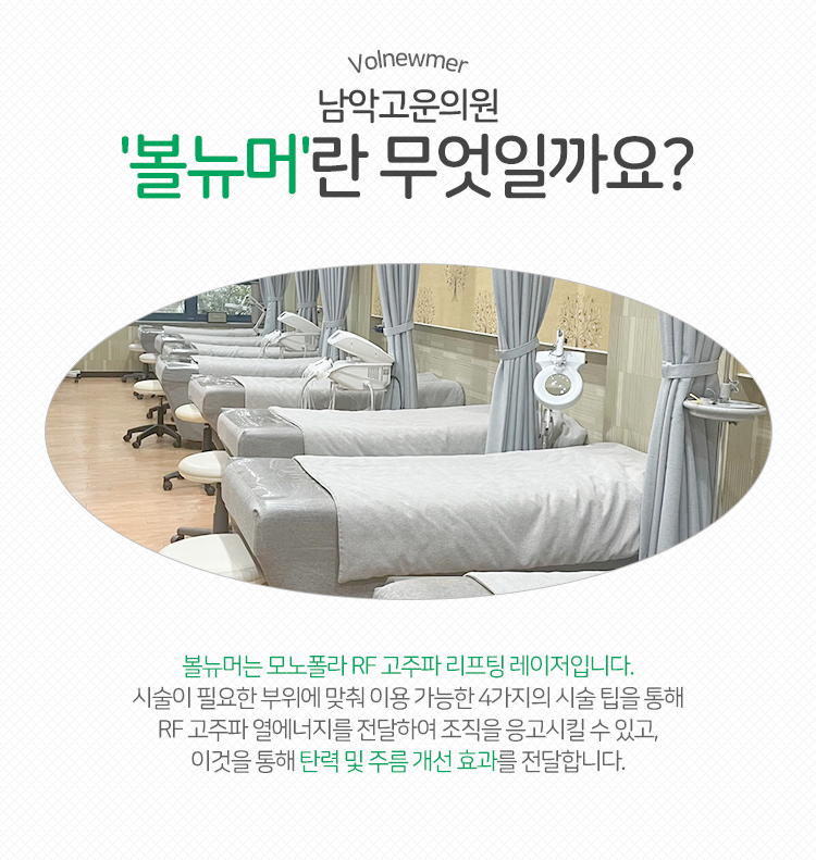 주로 활용이 되는 시술 두 가지로 슈링크 리프팅과 볼뉴머를 꼽을 수 있습니다. 이번에는 그 가운데에서도 볼뉴머 쪽에 더 집중을 하여 설명을 돕겠습니다. 해당 시술은 고주파 리프팅의 일종이라고 생각을 해 주시면 되겠는데요. 모노폴라 RF 고주파 에너지를 활용한다는 것이 특징으로, 내부에 열을 발생시키면서 진피층 깊은 곳까지 도달할 수 있습니다. 이때 생겨난 열은 피부 속 콜라겐, 엘라스틴 섬유를 자극하는 역할을 해 주게 되면서 자연스럽게 목포 볼뉴머가 탄력과 잔주름 개선에 도움이 되어 주는 것이라고 생각하시면 됩니다.