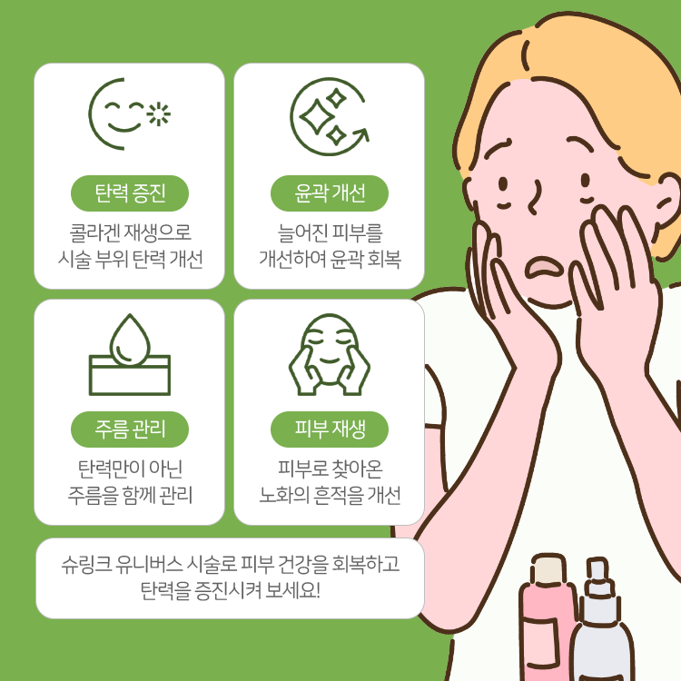 피부 탄력은 나이가 들면 어쩔 수 없이 저하될 수밖에 없는 영역이라 생각해 주시면 되겠습니다. 그 이유는 나이가 들수록 피부의 탄력을 유지해 주던 콜라겐, 엘라스틴 섬유가 감소하고 약해지기 때문입니다. 콜라겐과 엘라스틴이 풍부하게 존재하고 있을 때에는 탄력 있고 매끈한 상태를 유지하기가 용이합니다. 그러나 나이가 들면서 이런 성분이 점차 줄어들게 되고 질적으로도 약해지면 피부가 늘어지며 처지는 모습을 확인할 수 있습니다. 남악 리프팅 슈링크는 이런 때에 피부에 긍정적인 변화를 전달해 줄 수 있을 것이라 말씀을 드립니다.