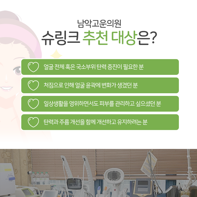 그러나 아무리 자외선 차단을 위해 노력한다 해도 표정 습관이나 흡연, 수면 부족, 노화 등이 합쳐지면서 얼마든지 문제가 벌어질 수 있습니다. 그렇기 때문에 남악 리프팅 슈링크를 통해 관리를 진행하는 게 중요한 일이 되는 것이라고 생각해 주시면 됩니다. 슈링크 리프팅은 고강도 집속 초음파를 이용한 피부 리프팅 시술입니다.