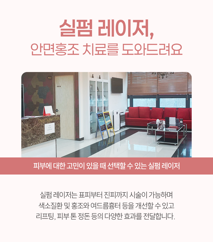 본원에서는 어떤 방식으로 치료를 진행하는지에 대해 궁금하실 듯합니다. 주로 활용이 되는 방식으로는 실펌 레이저를 사용하는 것입니다. 실펌레이저의 특징은 피부의 얕은 표피부터 깊은 진피까지 시술을 할 수 있다는 것인데, 이 과정 속에서 색소질환, 여드름 흉터, 그리고 이번에 중점적으로 설명을 드렸던 홍조까지 다양하게 개선 효과를 확인해 보실 수 있다고 설명을 전해드립니다. 때문에 피부의 결과 톤에 여러 가지 문제가 찾아와 복합적으로 피해를 입고 있을 때 이를 관리해 보실 수 있을 거라는 말씀을 전해드립니다.