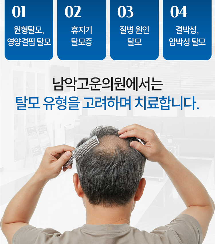 남악고운의원에서는 계속되는 잘못된 습관이 문제를 키울 수 있는 만큼 이제는 남악 탈모치료를 통해 상태를 개선해 주실 것을 당부드리고 있습니다. 내원을 하시면 문제 상태가 얼마나 악화되어 있는지를 파악해 나가면서 충분한 관리를 진행하실 수 있도록 도움을 전해드리고 있습니다.
