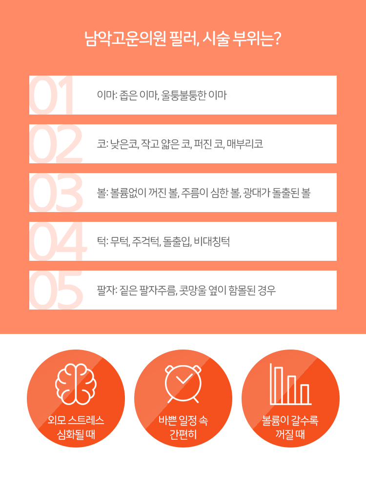 필러는 채운다는 뜻을 내포하고 있습니다.그 말 그대로 주름으로 인해 움푹 들어간 부분, 볼륨이 빠져 있는 부분에 히알루론산을 이용하여 평평하게 만들어 주면서 자연스럽게 주름을 개선할 수 있는 것이라고 남악고운의원이 말씀을 드립니다. 여기에서 히알루론산이라는 것은 기존부터 사람의 피부에 존재하는 물질이므로 비교적 안전하다 알려져 있습니다. 그렇기 때문에 피부에 무언가 들어온다는 것에 걱정을 가지기보다는 주름 개선에 초점을 맞춰 관리를 진행해 보시면 되겠습니다. 전반적으로 시술 과정이 길지 않아 일상생활 중 잠깐 시간을 내어 관리를 진행하기에도 용이할 것이라고 말씀을 전해드렸습니다.