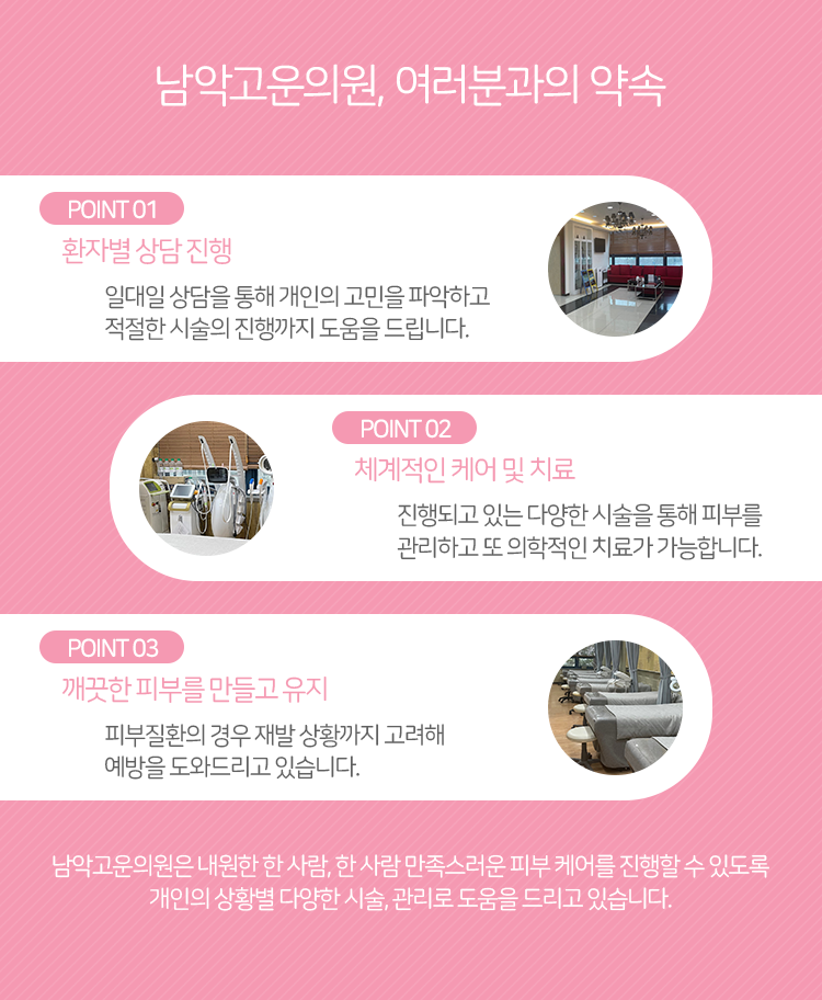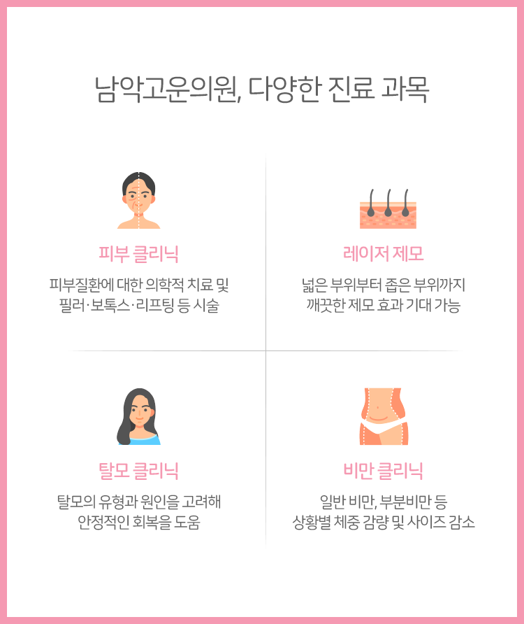 안녕하세요. 남악고운의원입니다. 본원은 다양한 시술을 통해 누구나 가질 수 있는 피부 고민을 개선하는 데 도움을 드리고 있습니다. 여드름 등 특정 질환의 치료 효과는 물론이거니와 보톡스, 필러, 리프팅, 물광주사 등 특정 시술로 불안정한 피부의 상태를 개선하는 데 초점을 맞추기도 합니다.