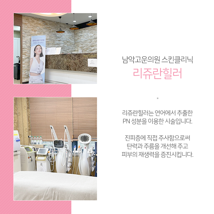 기본적으로 리쥬란힐러라는 것은 연어에서 추출한 성분인 폴리뉴클레오타이드(PN)를 주성분으로 한 피부 재생 시술이라 생각해 주시면 되겠습니다. 생체 친화적인 물질이라 알려져 있는 만큼 안정적으로 피부 안쪽에서 다양한 효과를 전달해 드릴 수 있습니다. 그렇기 때문에 피부에 대한 고민을 지니고 있는 분들이라면 한 번쯤 들어 보셨을 시술이라는 것 역시도 알 수 있었는데요. 내원을 하시게 되면 피부의 상태에 따라 다양한 시술을 확인해 보실 수 있고 그 가운데 하나로 리쥬란 힐러 시술 역시 가능하다고 생각해 주시면 되겠습니다.