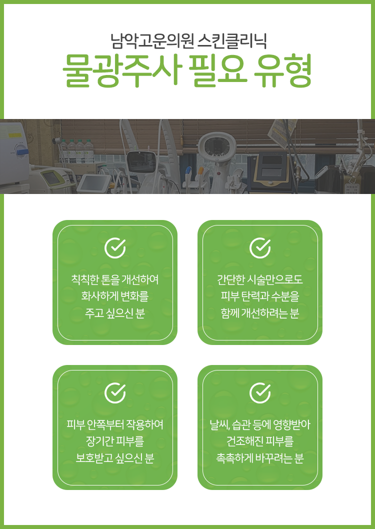 피부의 상태는 세월이 흐르게 되면서 자연스럽게 변모하기 마련입니다. 나이가 들며 생기는 노화만이 아니라 주변 환경의 변화나 생활 습관 등이 피부의 상태를 끊임없이 악화시킬 수 있다는 의미였습니다. 그렇기 때문에 시시각각 변화는 피부의 상태를 고려하여 그에 따른 관리를 진행하는 게 현명합니다. 남악 물광주사 이외에도 보톡스, 필러, 리프팅, 프락셀 등 상황에 따른 여러 시술을 확인하실 수 있으니 참고 바라겠습니다.