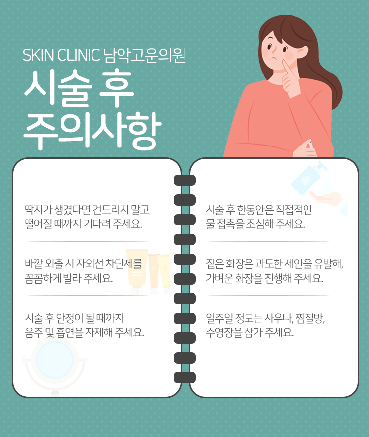 시술을 마쳤다면 이후에 이루어지는 사후 관리 역시 중요하다는 점을 강조드리고 싶습니다. 레이저를 통해 점을 제거한 부위에는 자연스럽게 딱지가 생기게 되는데 이때 인위적으로 딱지를 떼지 마시라는 당부의 안내를 드렸는데요. 시술 부위에 형성된 딱지는 외부의 세균 침입을 막아주고 내부에서 새로운 살이 차오를 수 있도록 보호하는 역할을 수행하는 데다 함부로 떼려 들면 오히려 색소침착이 남을 수 있으니 주의해 주셔야 하겠습니다. 감사합니다.