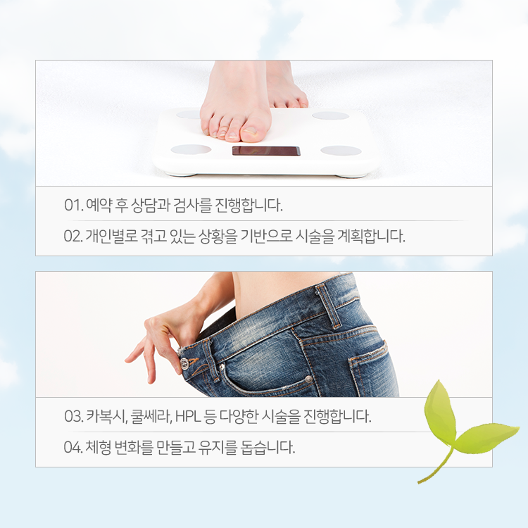 이는 인체에 해가 가해지지 않는 이산화탄소를 주입하는 방식으로 지방세포를 분해할 수 있다는 특징을 가지고 있는 시술이었습니다. 카복시 테라피는 고민이 되는 목포 비만 다양한 신체 부위에 폭넓게 적용할 수 있다는 장점이 있어 평소 유독 살이 잘 빠지지 않던 부분에 대한 관리 효과를 기대하심이 가능했습니다. 주로 복부나 허벅지 그리고 팔뚝과 종아리 등 지방이 두껍게 쌓이기 쉬운 부위에 시술이 가능하며 이를 통해 국소적인 체지방 감소를 유도할 수 있다는 안내를 드렸습니다.
